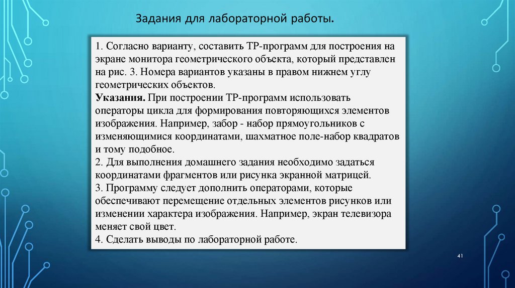Задания для лабораторной работы.1. Согласно варианту, составить TP-программ для построения на