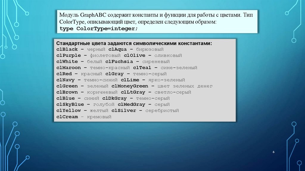 Модуль GraphABC содержит константы и функции для работы с цветами. ТипColorType, описывающий цвет, определен следующим образом: