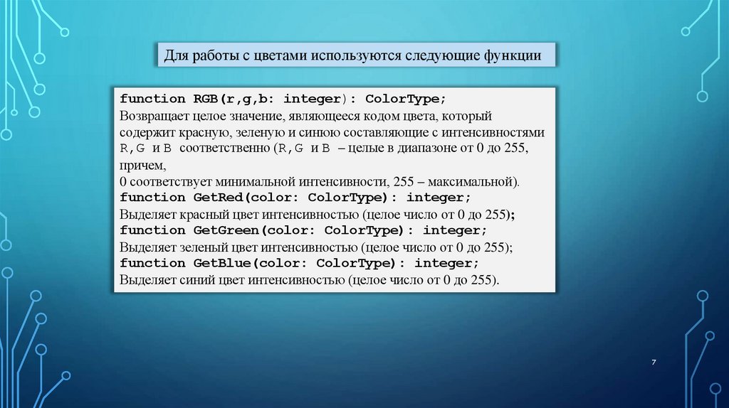 Для работы с цветами используются следующие функцииfunction RGB(r,g,b: integer): ColorType;