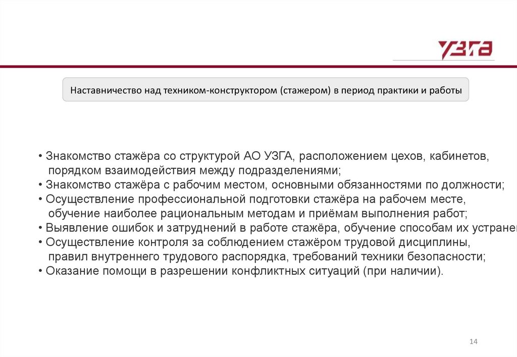 Наставничество над техником-конструктором (стажером) в период практики и работы• Знакомство стажёра со структурой АО УЗГА, расположением цехов, кабинетов,