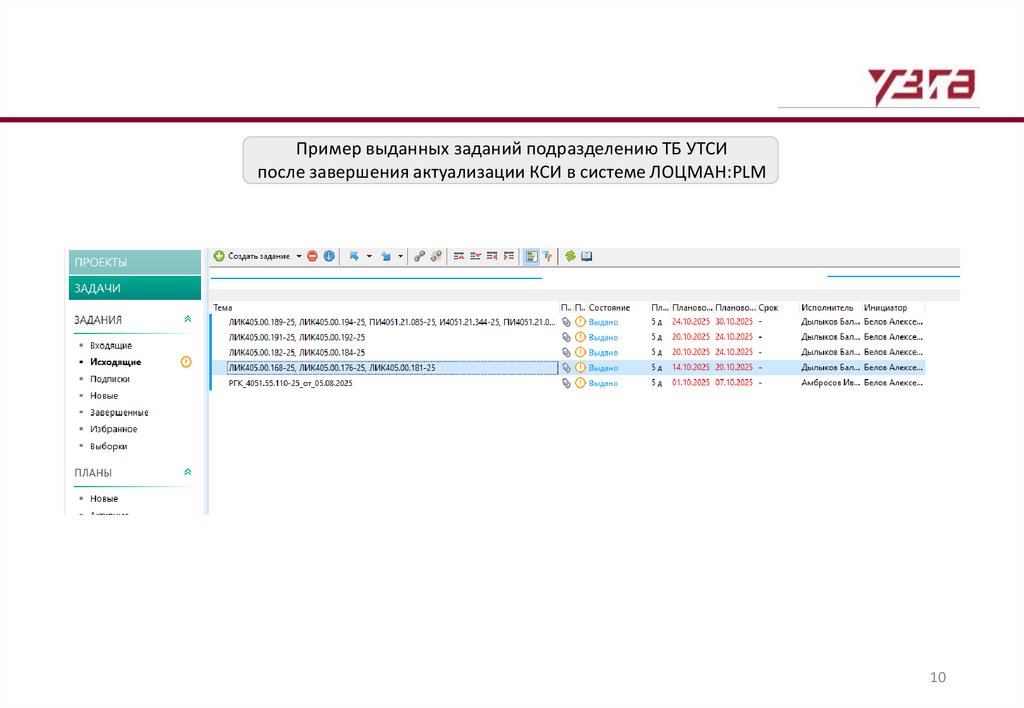 Пример выданных заданий подразделению ТБ УТСИпосле завершения актуализации КСИ в системе ЛОЦМАН:PLM