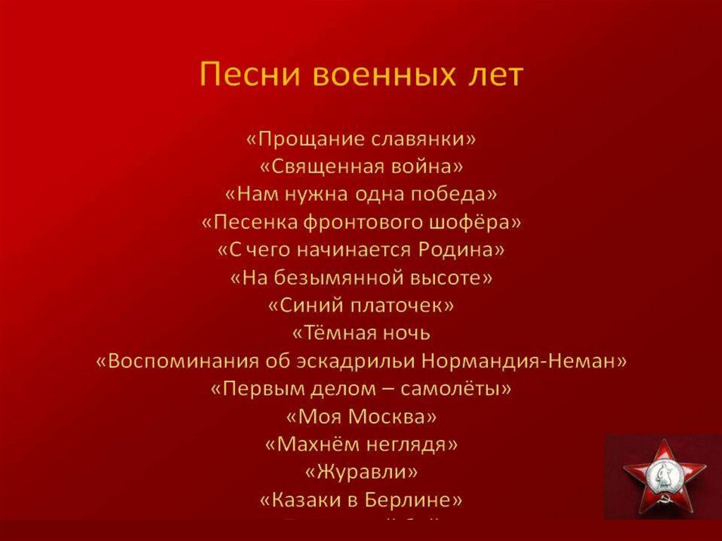 Цель: познакомиться с песнями ВеликойОтечественной войны , рассмотреть их