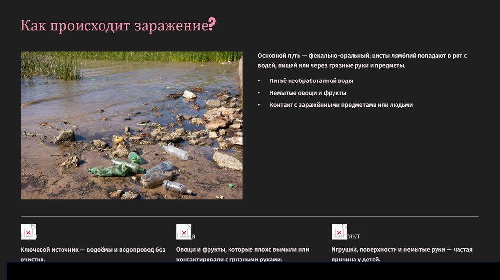 Как происходит заражение?Основной путь — фекально-оральный: цисты лямблий попадают в рот с