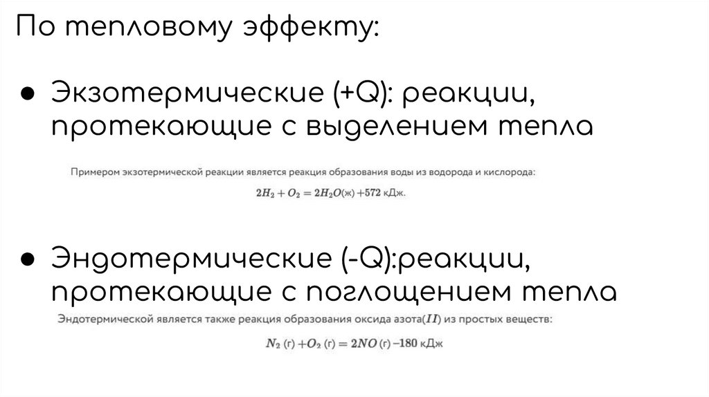 По тепловому эффекту:● Экзотермические (+Q): реакции,