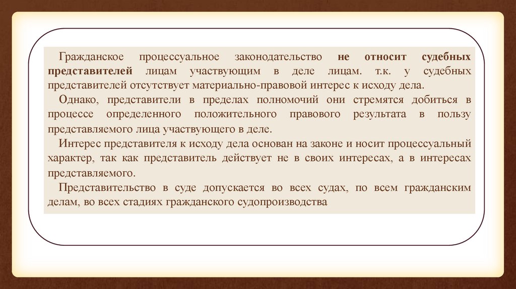 Интерес представителя к исходу дела основан на законе и носит процессуальный