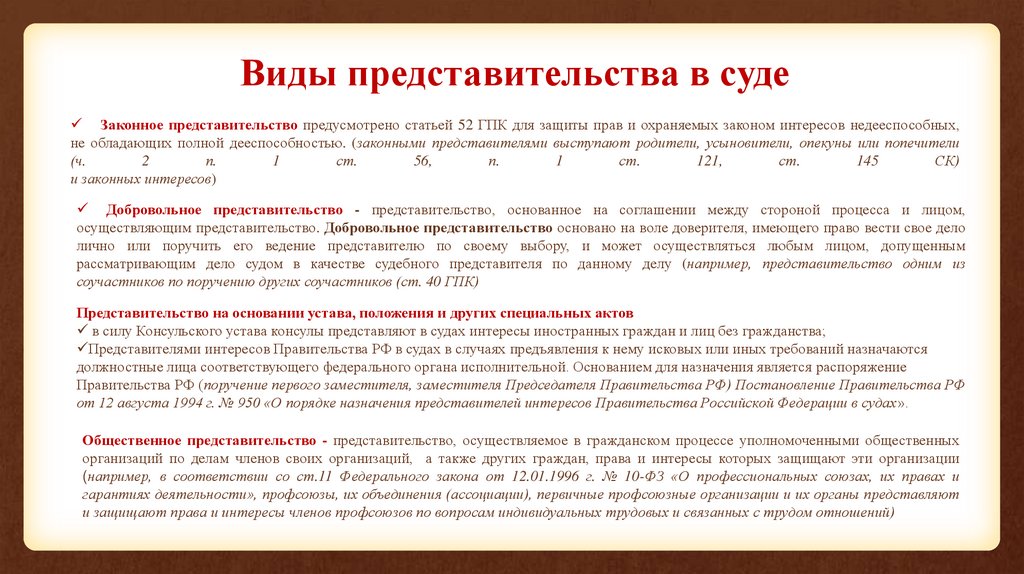 Виды представительства в судеЗаконное представительство предусмотрено статьей 52 ГПК для защиты прав и охраняемых законом интересов недееспособных,