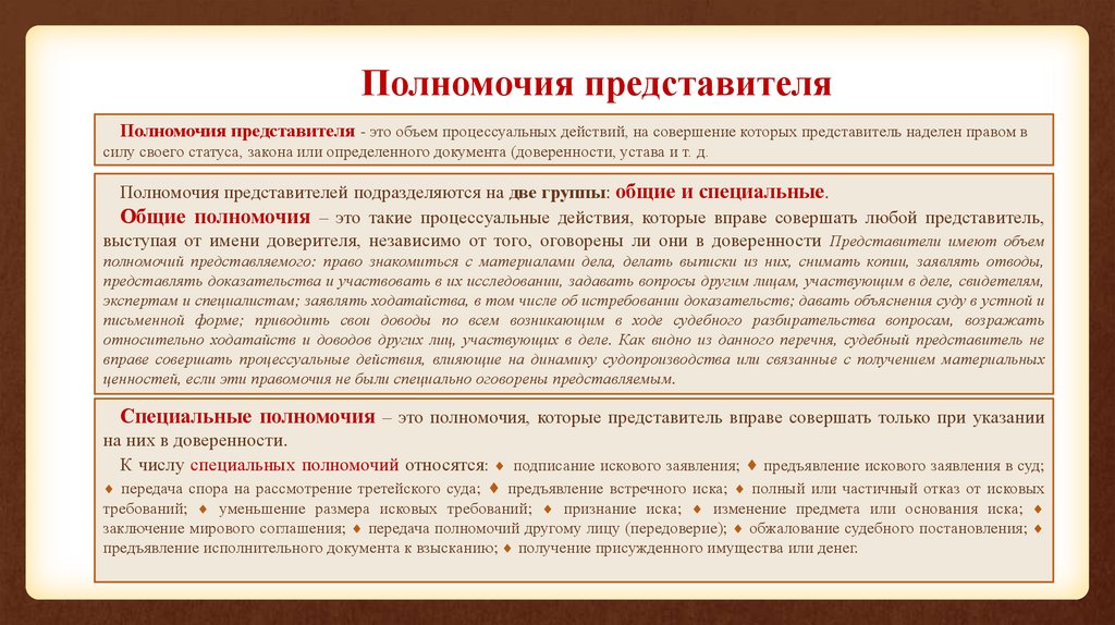 Полномочия представителяПолномочия представителя - это объем процессуальных действий, на совершение которых представитель наделен правом в