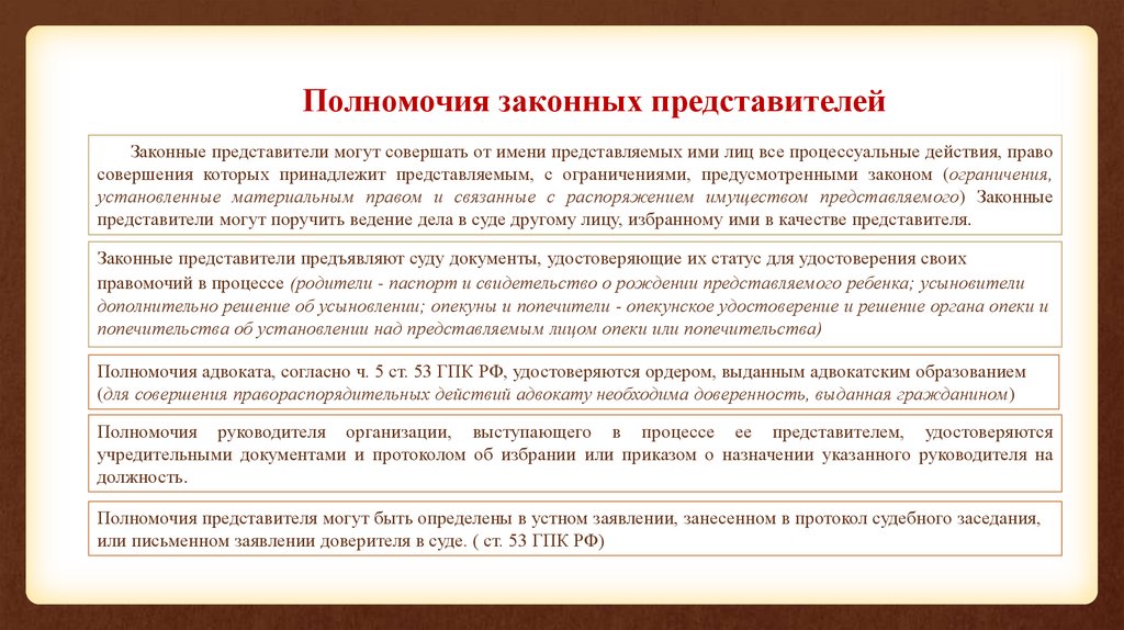 Полномочия законных представителейЗаконные представители могут совершать от имени представляемых ими лиц все процессуальные действия, право