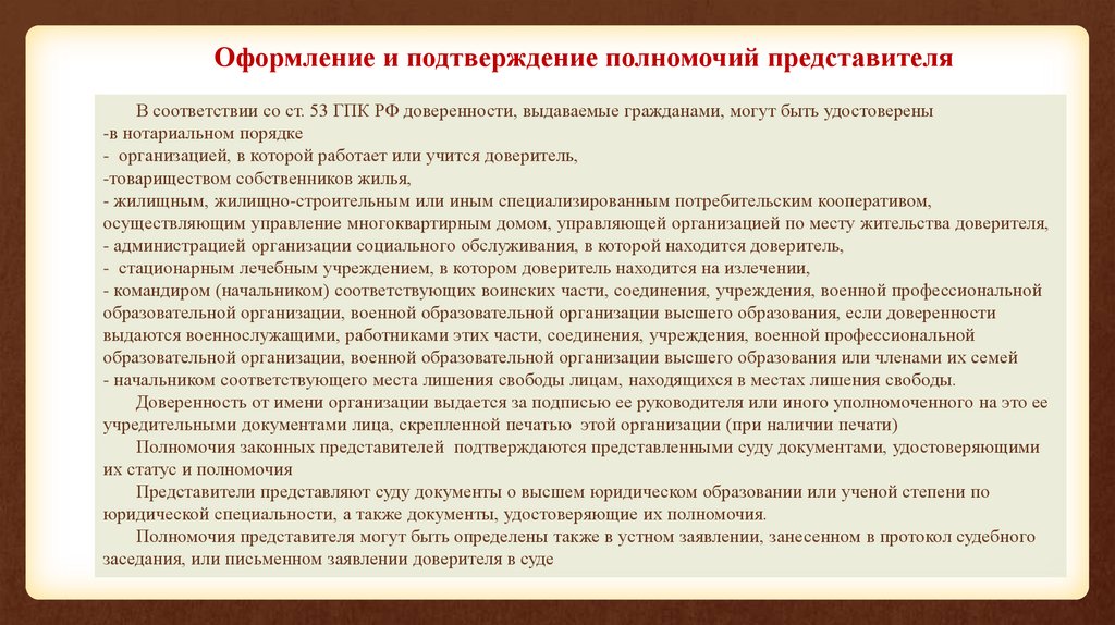 Оформление и подтверждение полномочий представителяВ соответствии со ст. 53 ГПК РФ доверенности, выдаваемые гражданами, могут быть удостоверены