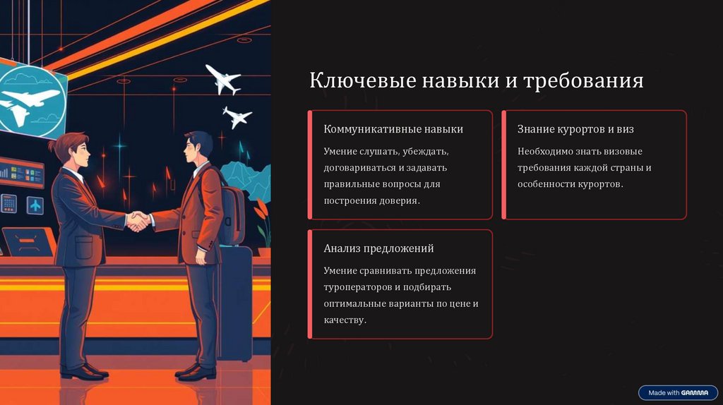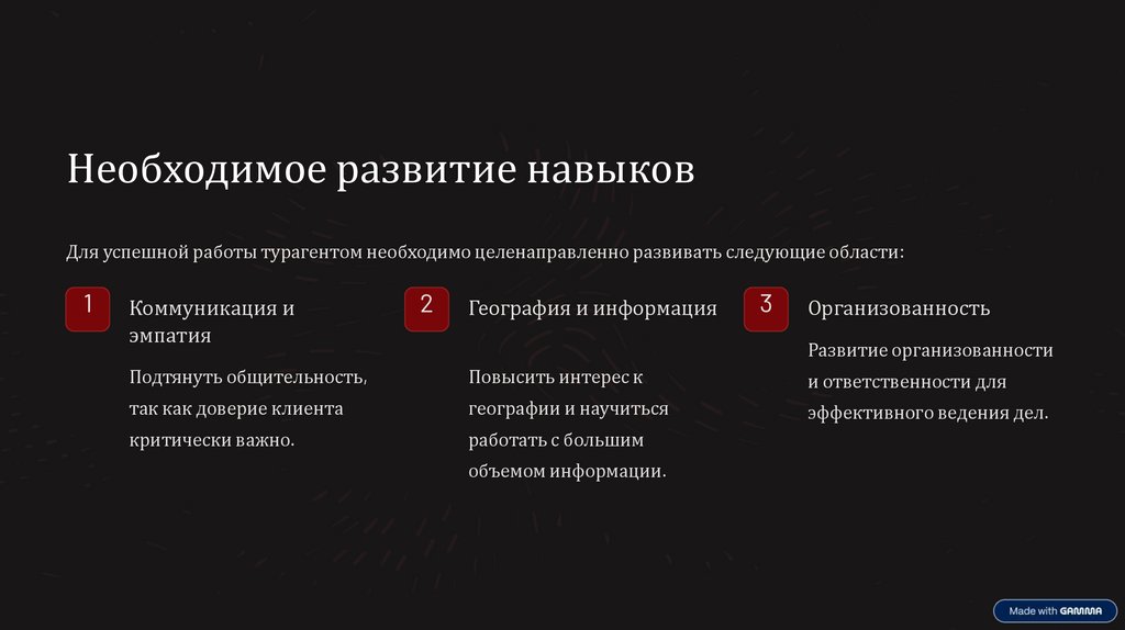 Необходимое развитие навыковДля успешной работы турагентом необходимо целенаправленно развивать следующие области: