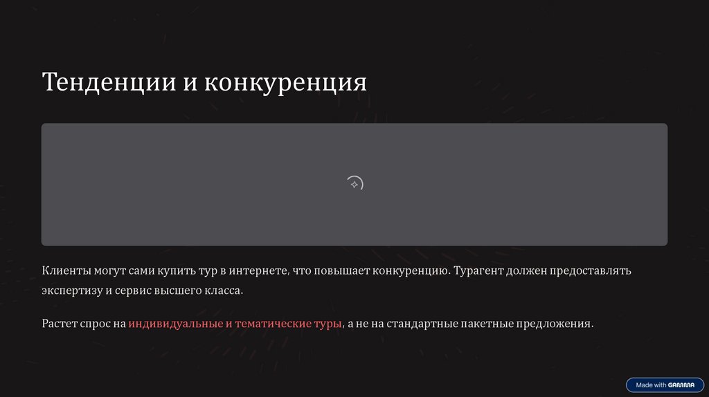 Тенденции и конкуренцияКлиенты могут сами купить тур в интернете, что повышает конкуренцию. Турагент должен предоставлять