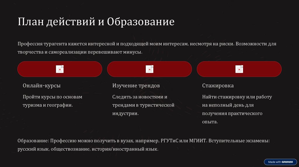 План действий и ОбразованиеПрофессия турагента кажется интересной и подходящей моим интересам, несмотря на риски. Возможности для