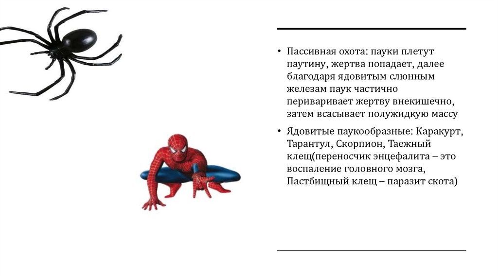 • Пассивная охота: пауки плетутпаутину, жертва попадает, далее