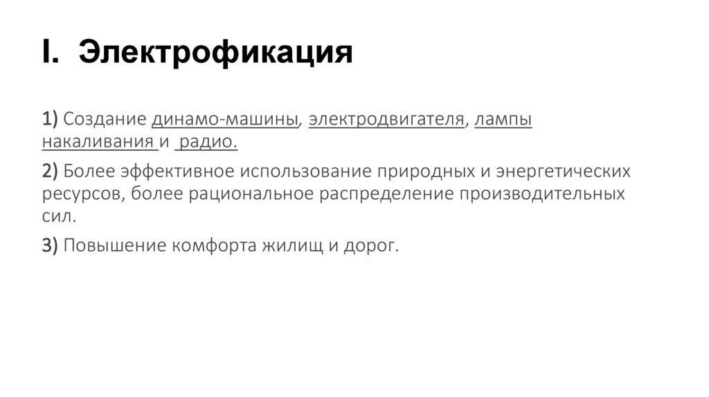 I. Электрофикация1) Создание динамо-машины, электродвигателя, лампы