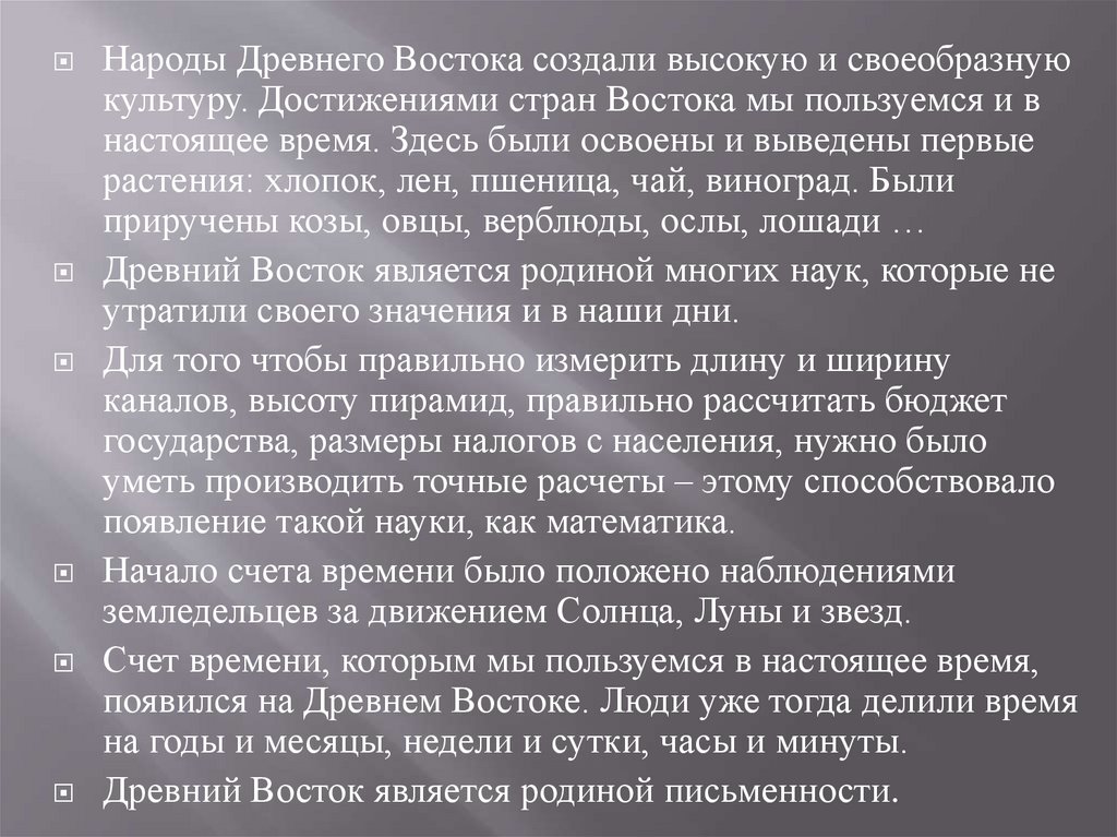 Народы Древнего Востока создали высокую и своеобразнуюкультуру. Достижениями стран Востока мы пользуемся и в