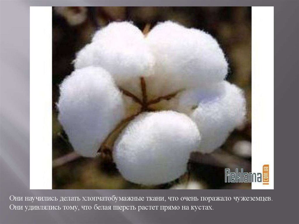 Они научились делать хлопчатобумажные ткани, что очень поражало чужеземцев.Они удивлялись тому, что белая шерсть растет прямо на кустах.