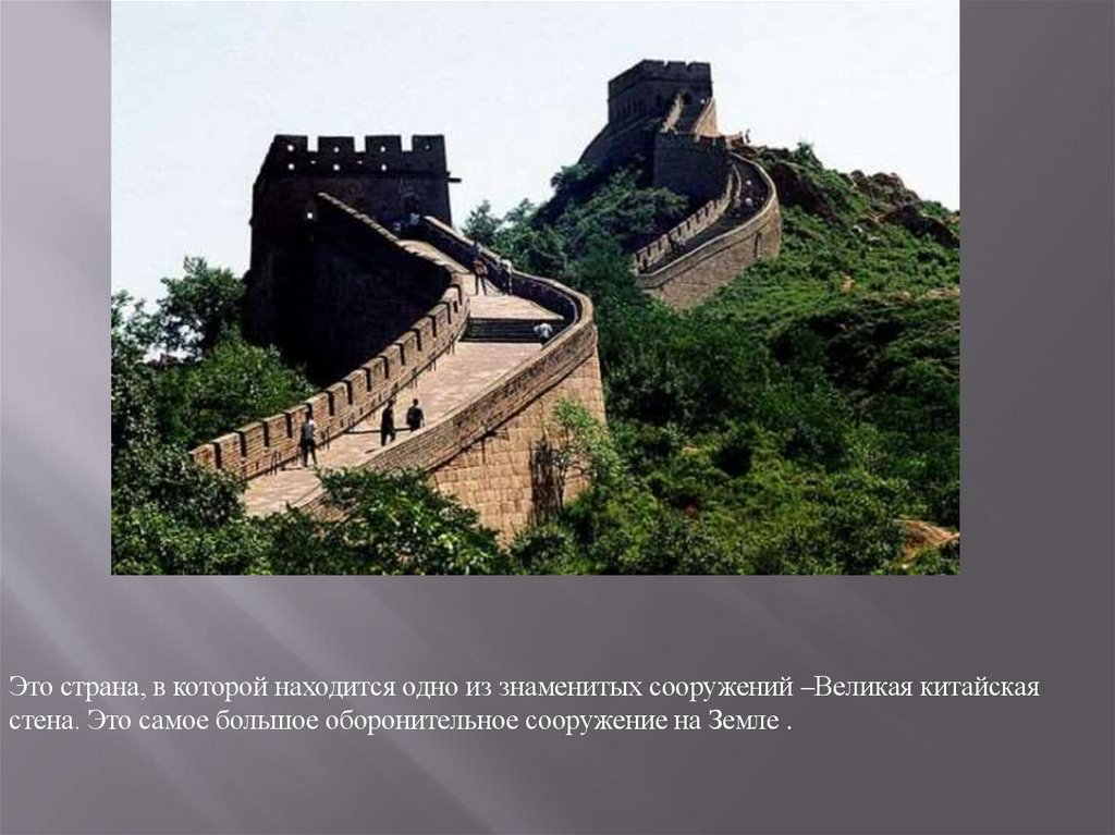Это страна, в которой находится одно из знаменитых сооружений –Великая китайскаястена. Это самое большое оборонительное сооружение на Земле .