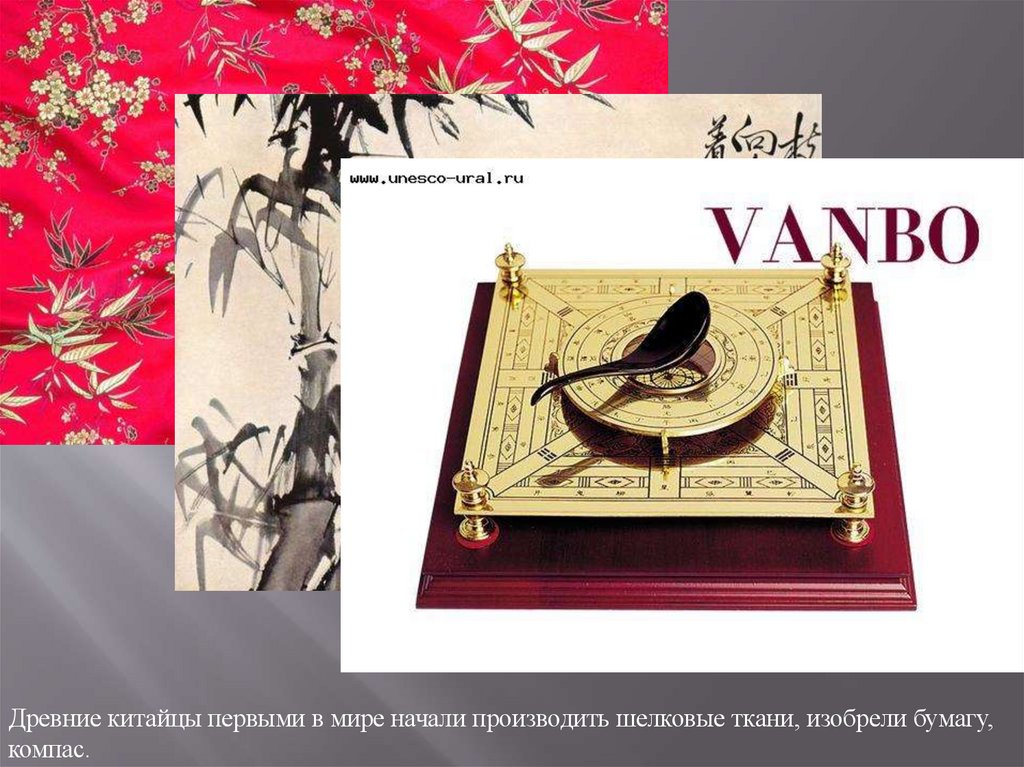 Древние китайцы первыми в мире начали производить шелковые ткани, изобрели бумагу,компас.