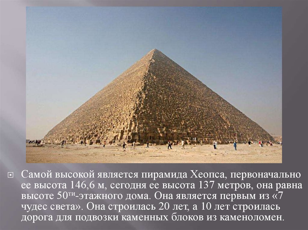 Самой высокой является пирамида Хеопса, первоначальноее высота 146,6 м, сегодня ее высота 137 метров, она равна