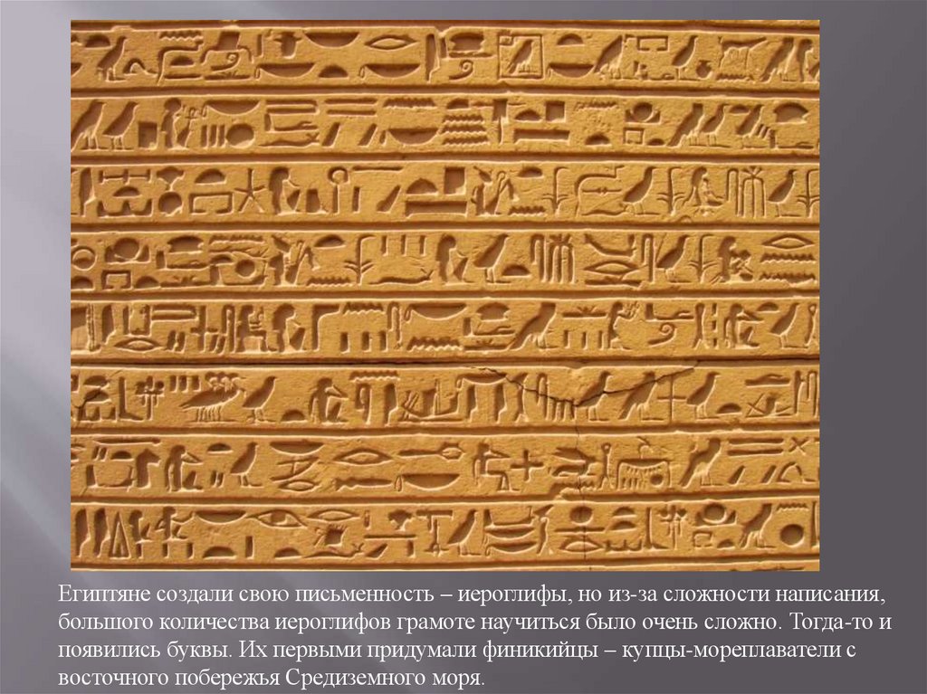 Египтяне создали свою письменность – иероглифы, но из-за сложности написания,большого количества иероглифов грамоте научиться было очень сложно. Тогда-то и