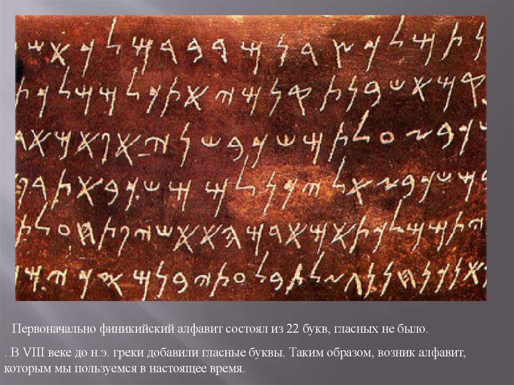 Первоначально финикийский алфавит состоял из 22 букв, гласных не было.. В VIII веке до н.э. греки добавили гласные буквы. Таким образом, возник алфавит,