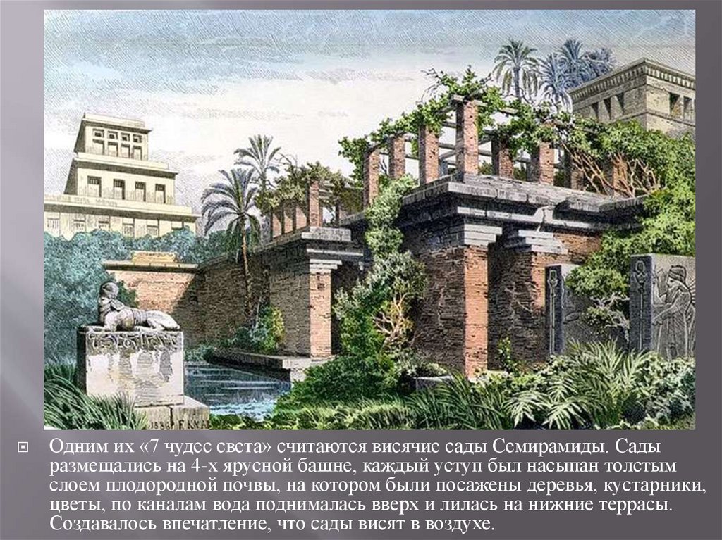 Одним их «7 чудес света» считаются висячие сады Семирамиды. Садыразмещались на 4-х ярусной башне, каждый уступ был насыпан толстым