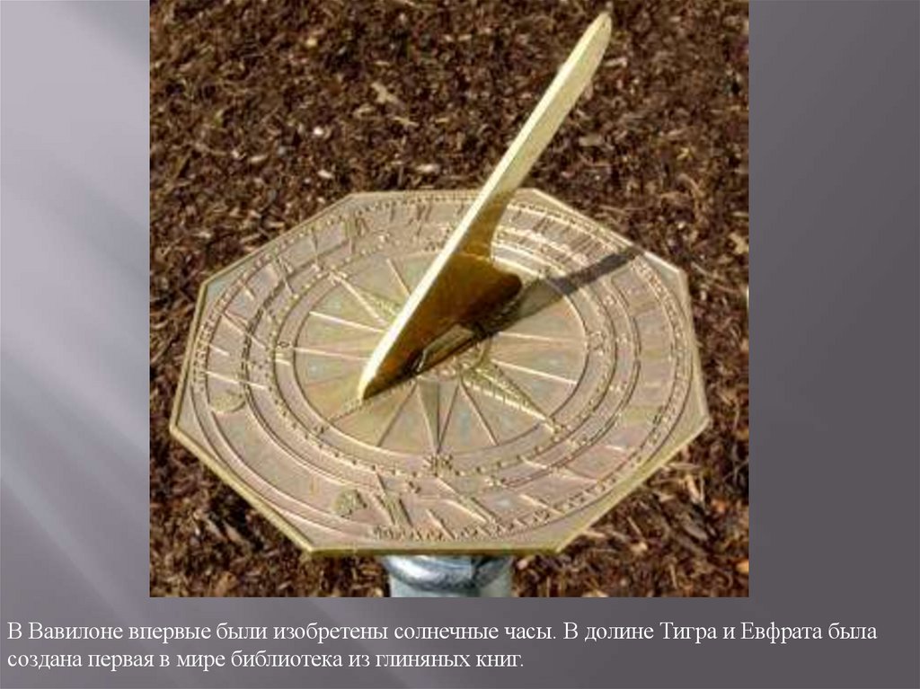 В Вавилоне впервые были изобретены солнечные часы. В долине Тигра и Евфрата быласоздана первая в мире библиотека из глиняных книг.