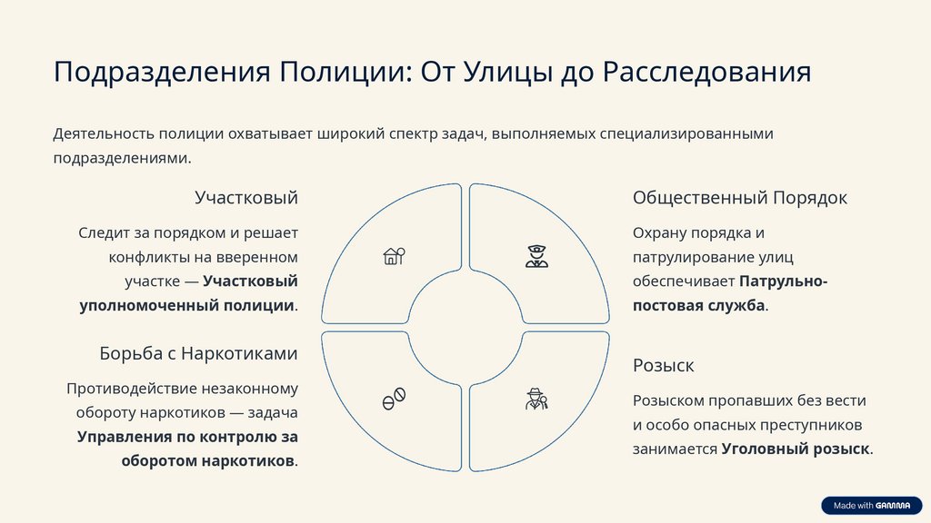 Подразделения Полиции: От Улицы до РасследованияДеятельность полиции охватывает широкий спектр задач, выполняемых специализированными