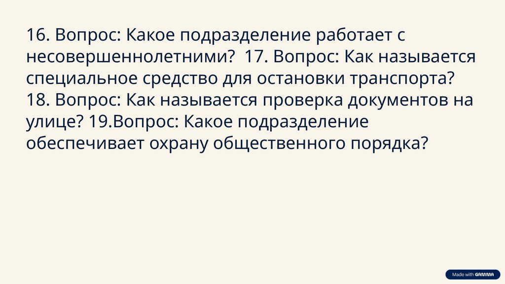 16. Вопрос: Какое подразделение работает снесовершеннолетними? 17. Вопрос: Как называется