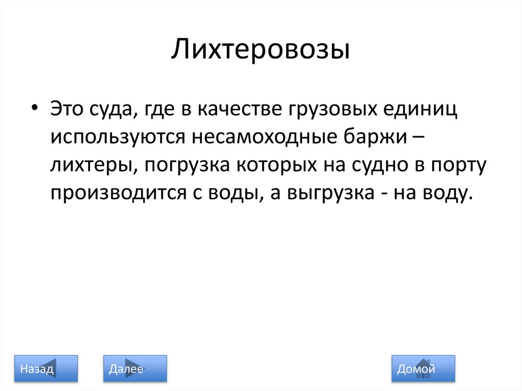 Лихтеровозы• Это суда, где в качестве грузовых единиц