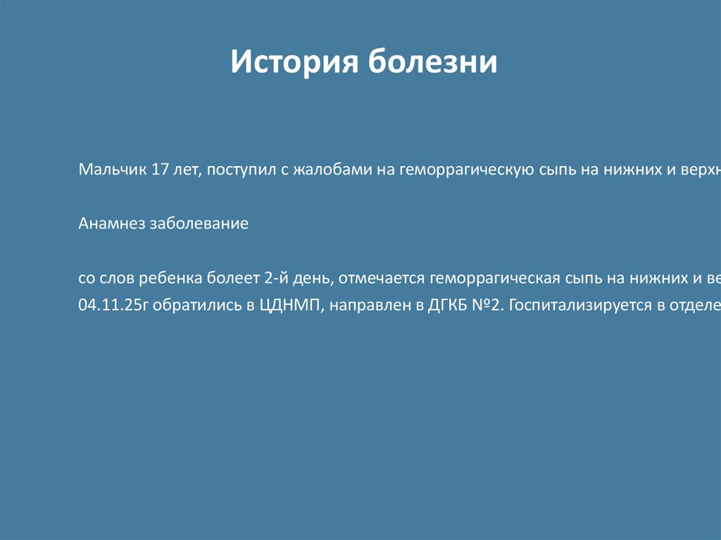 Мальчик 17 лет, поступил с жалобами на геморрагическую сыпь на нижних и верхн