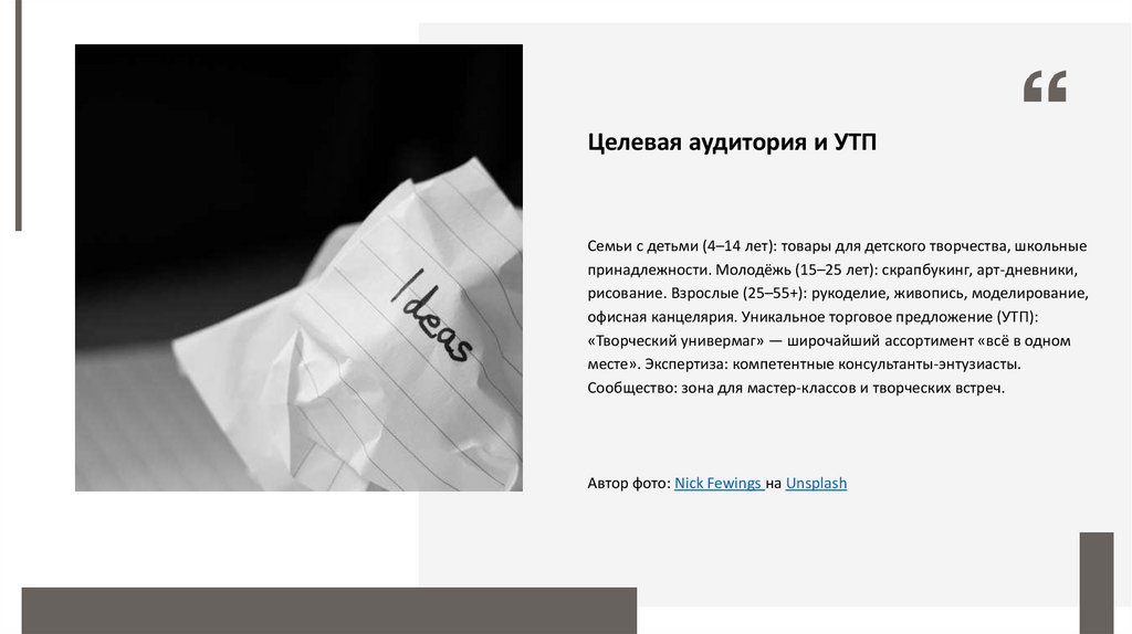 Целевая аудитория и УТПСемьи с детьми (4–14 лет): товары для детского творчества, школьные