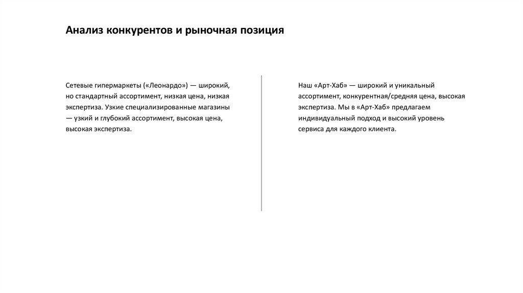 Анализ конкурентов и рыночная позицияСетевые гипермаркеты («Леонардо») — широкий,