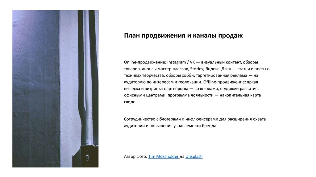 План продвижения и каналы продажOnline-продвижение: Instagram / VK — визуальный контент, обзоры