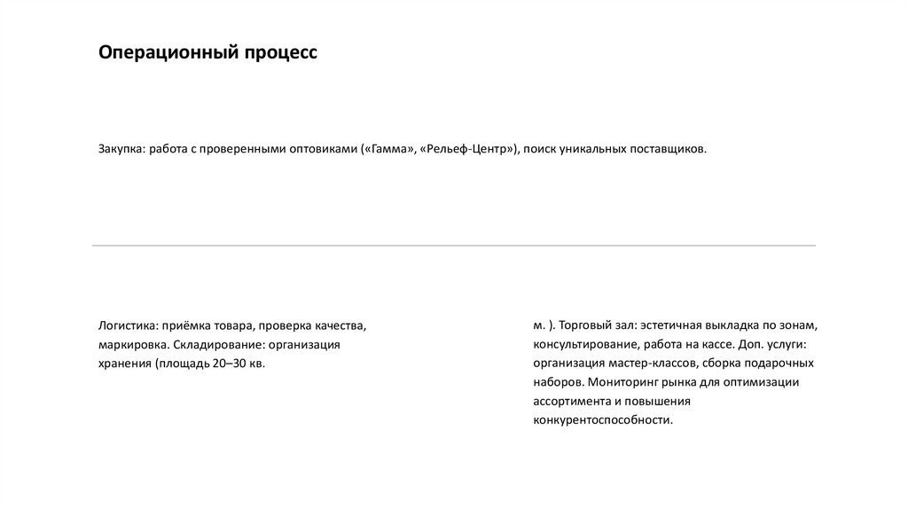 Операционный процессЗакупка: работа с проверенными оптовиками («Гамма», «Рельеф-Центр»), поиск уникальных поставщиков.