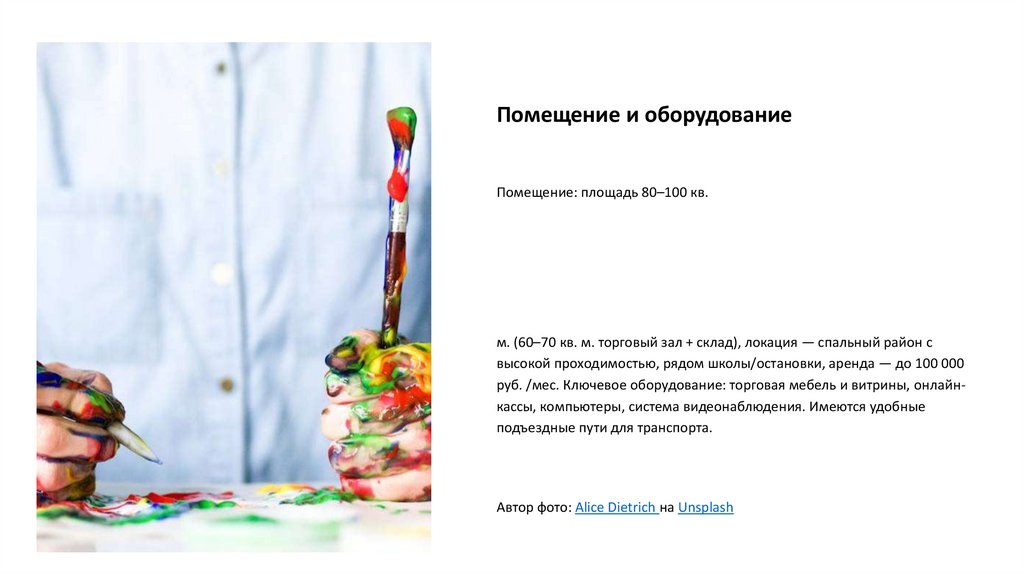 Помещение и оборудованиеПомещение: площадь 80–100 кв.