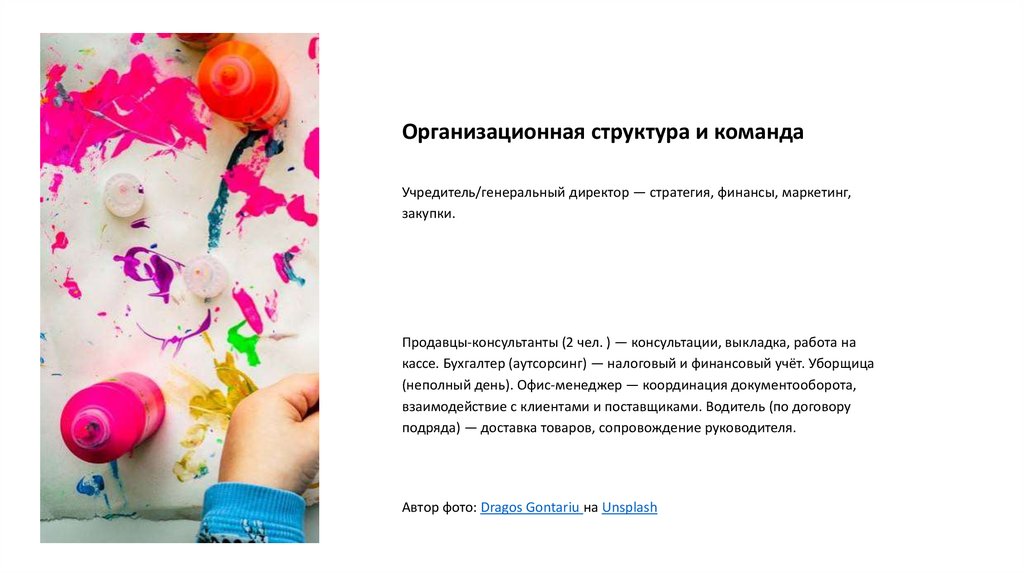 Организационная структура и командаУчредитель/генеральный директор — стратегия, финансы, маркетинг,