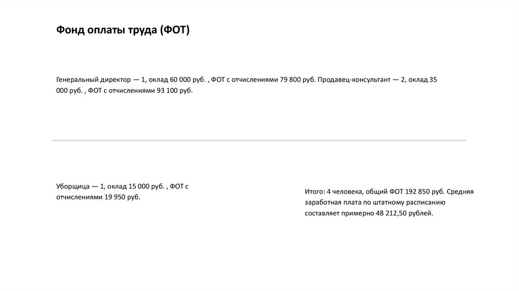 Фонд оплаты труда (ФОТ)Генеральный директор — 1, оклад 60 000 руб. , ФОТ с отчислениями 79 800 руб. Продавец-консультант — 2, оклад 35