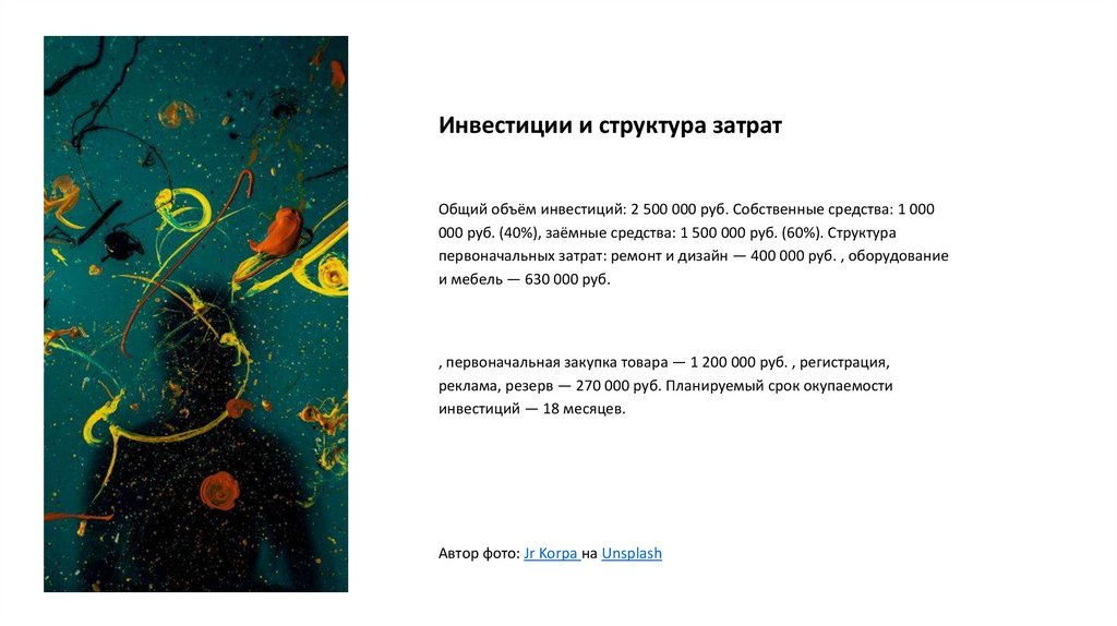 Инвестиции и структура затратОбщий объём инвестиций: 2 500 000 руб. Собственные средства: 1 000