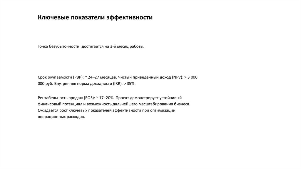 Ключевые показатели эффективностиТочка безубыточности: достигается на 3-й месяц работы.