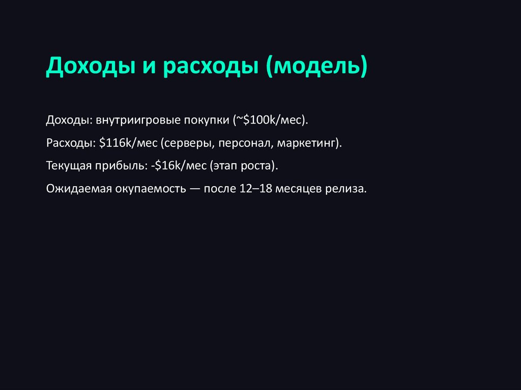 Доходы и расходы (модель)Доходы: внутриигровые покупки (~$100k/мес).