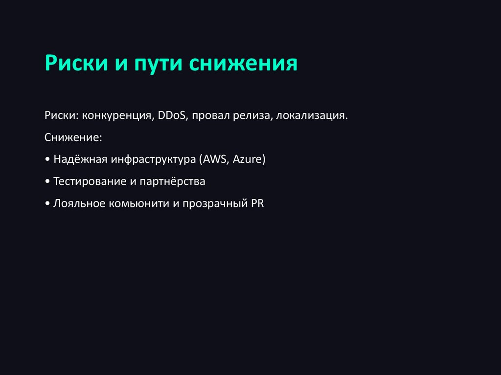 Риски и пути сниженияРиски: конкуренция, DDoS, провал релиза, локализация.
