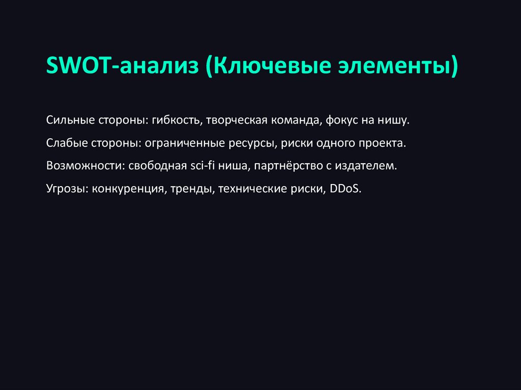 SWOT-анализ (Ключевые элементы)Сильные стороны: гибкость, творческая команда, фокус на нишу.