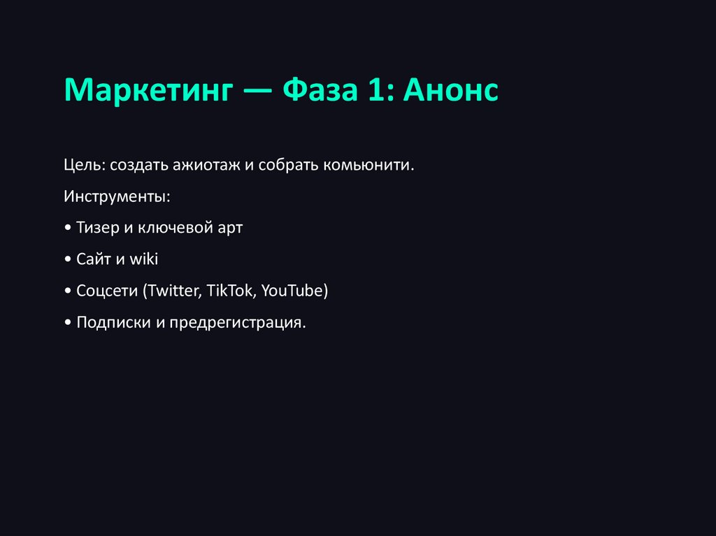Маркетинг — Фаза 1: АнонсЦель: создать ажиотаж и собрать комьюнити.