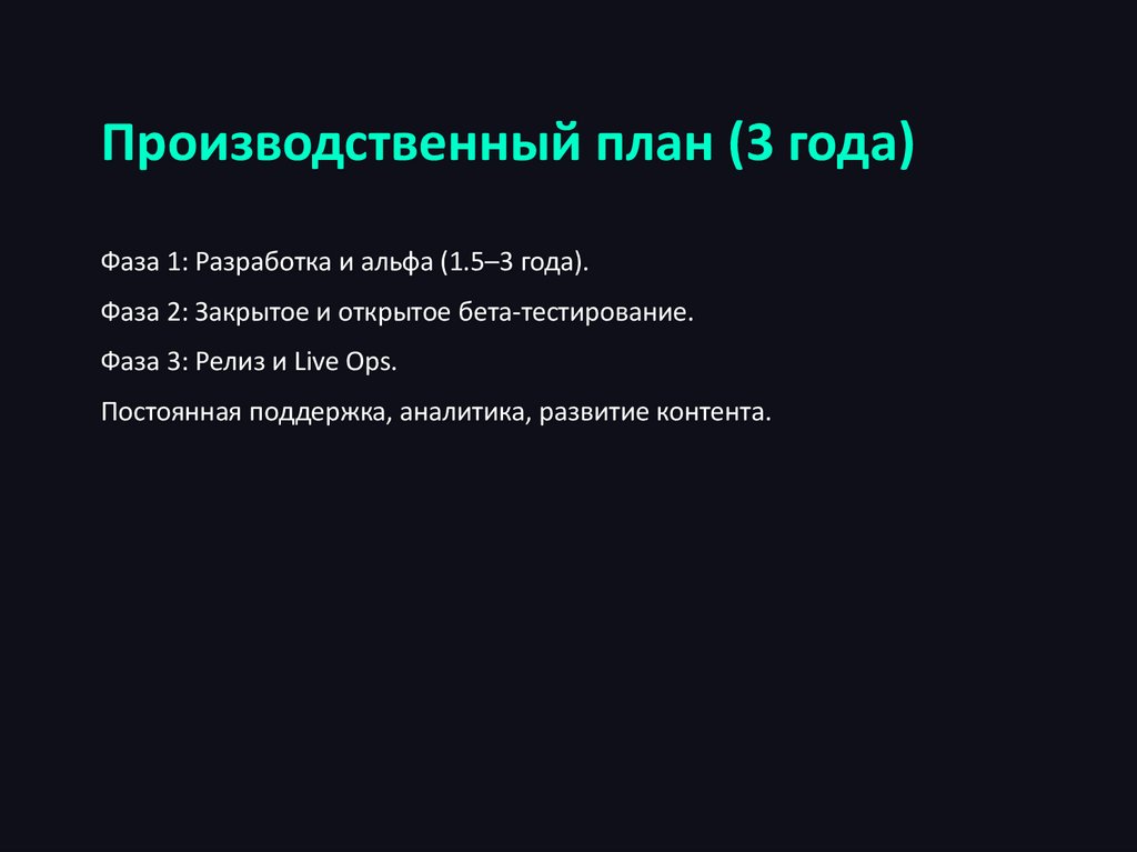 Производственный план (3 года)Фаза 1: Разработка и альфа (1.5–3 года).