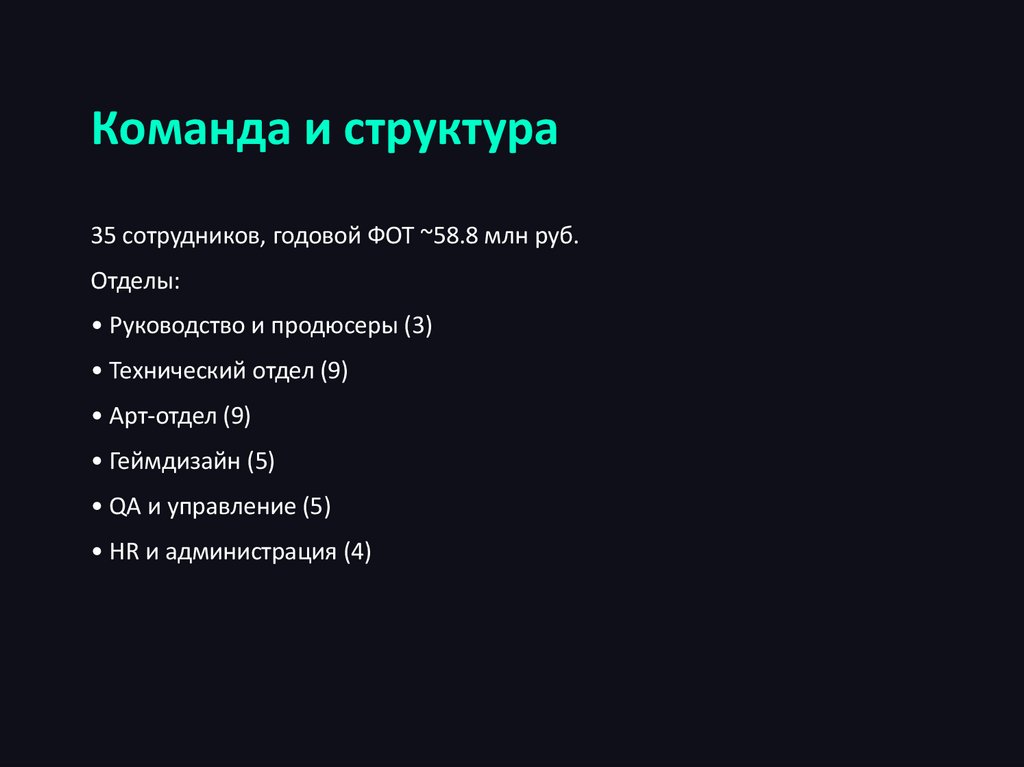 Команда и структура35 сотрудников, годовой ФОТ ~58.8 млн руб.
