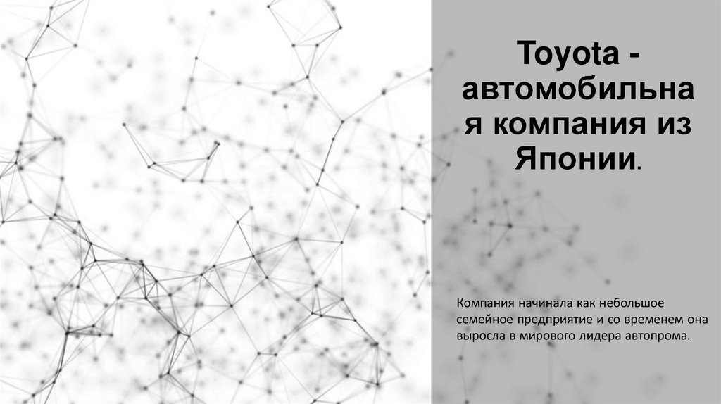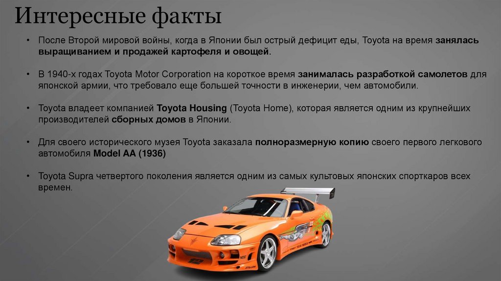Интересные факты• После Второй мировой войны, когда в Японии был острый дефицит еды, Toyota на время занялась
