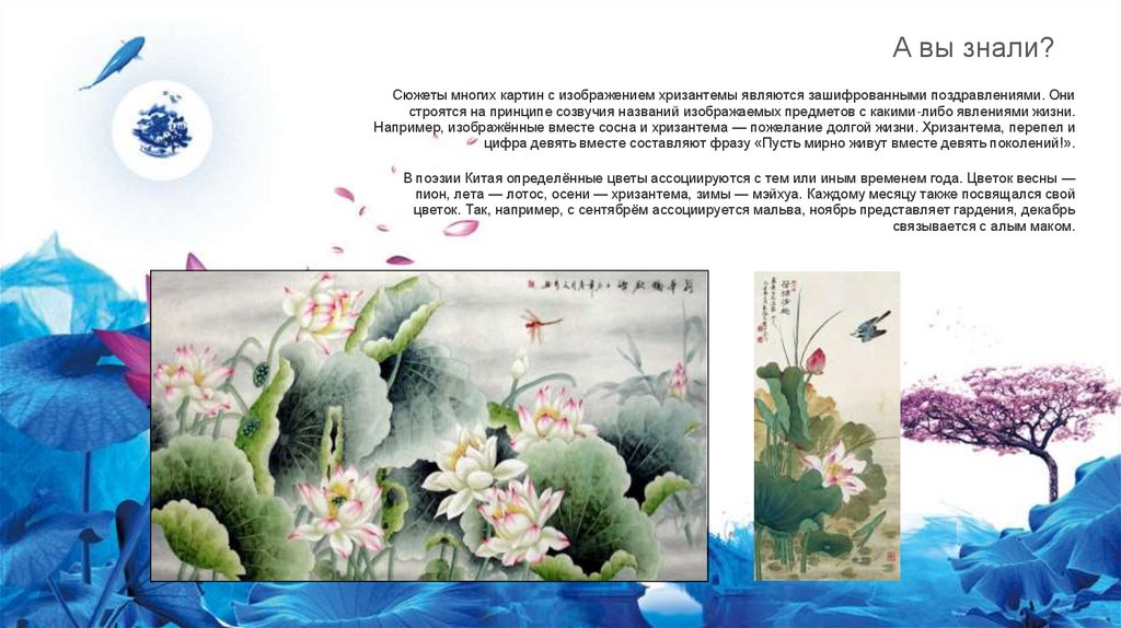 А вы знали?Сюжеты многих картин с изображением хризантемы являются зашифрованными поздравлениями. Они