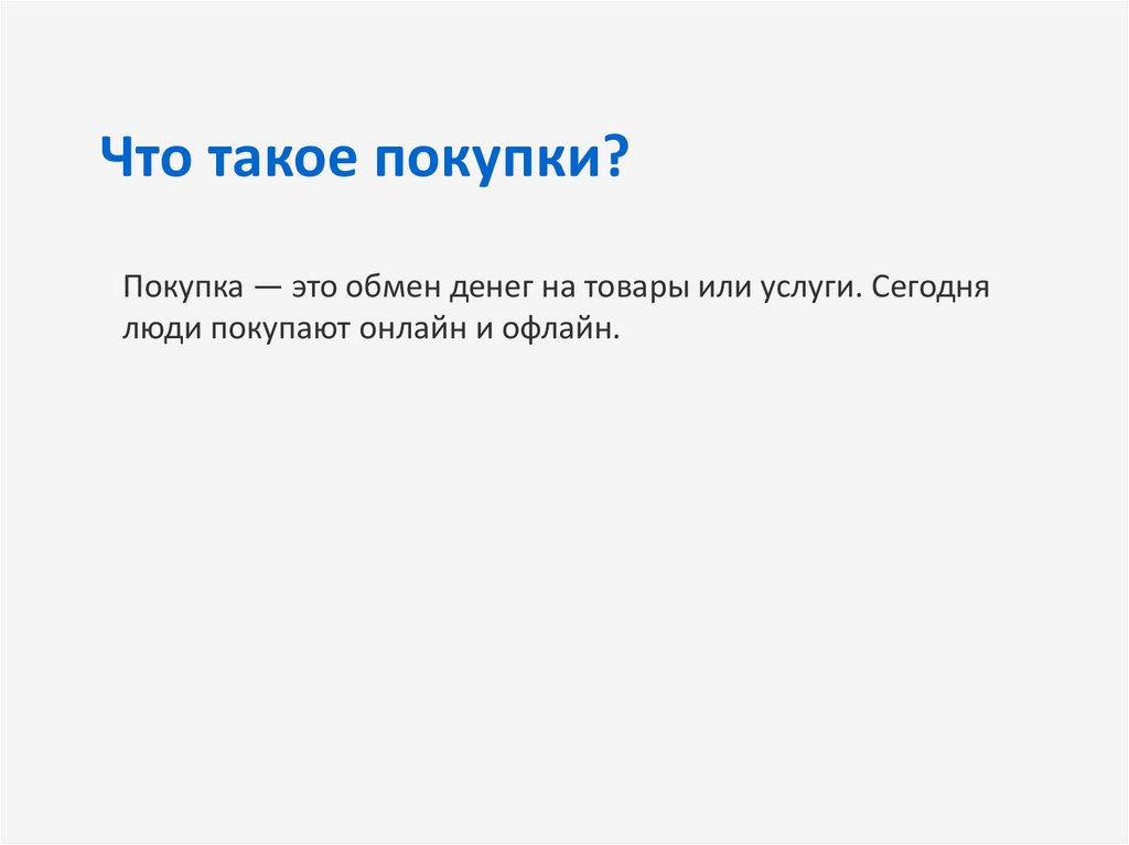 Что такое покупки?Покупка — это обмен денег на товары или услуги. Сегодня