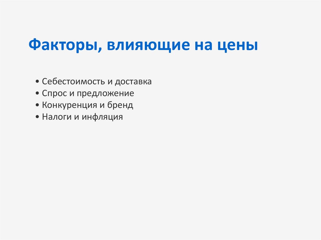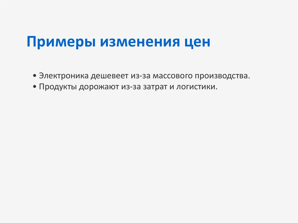 Примеры изменения цен• Электроника дешевеет из-за массового производства.